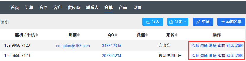 可以在操作栏内进行指派、沟通、地址、编辑、确认、忽略操作。