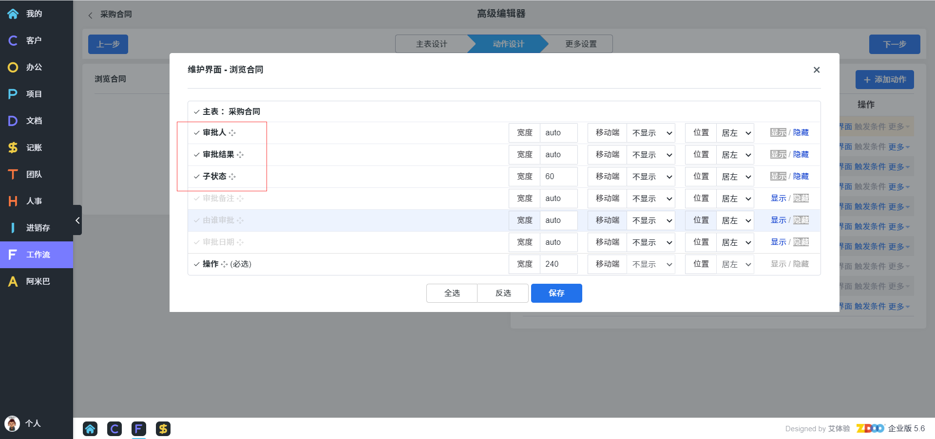 创建采购合同-扩展动作,修改审批人和子状态。这里我们的审批人是确定的,即admin,在此处直接设定就好。如果我们的审批人不确定,如需要各部门负责人审批,那我们可以在创建采购合同-界面,显示审批人字段,由采购合同创建者选定自己的审批人。