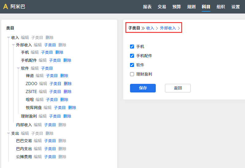 在 6.1 启用阿米巴 章节里我们说过,启用阿米巴后要设置好现金流应用中的科目。在阿米巴应用中,我们要把这些科目和阿米巴科目进行关联。阿米巴科目我们分为5类:外部收入、内部收入、巴巴交易、巴内支出、公摊费用。外部收入、巴内支出和公摊费用的设置界面如上图所示,和现金流应用中设置的科目进行关联;内部收入和巴巴交易的设置界面如下图所示,需要新建。