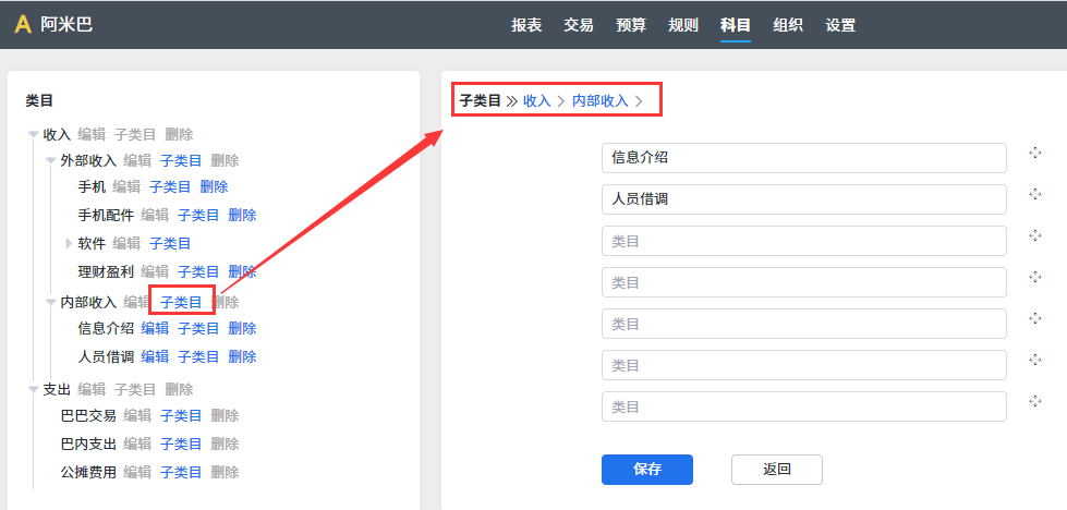 进入阿米巴应用,点击“科目”菜单可以进行阿米巴科目的设置。如图: