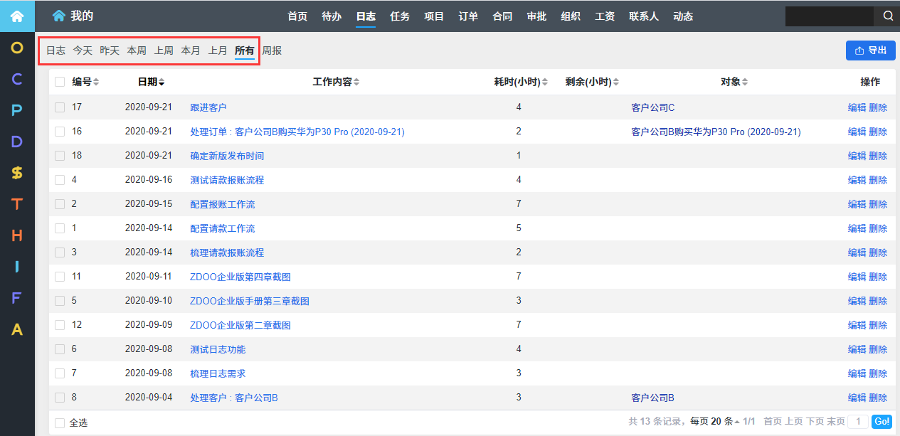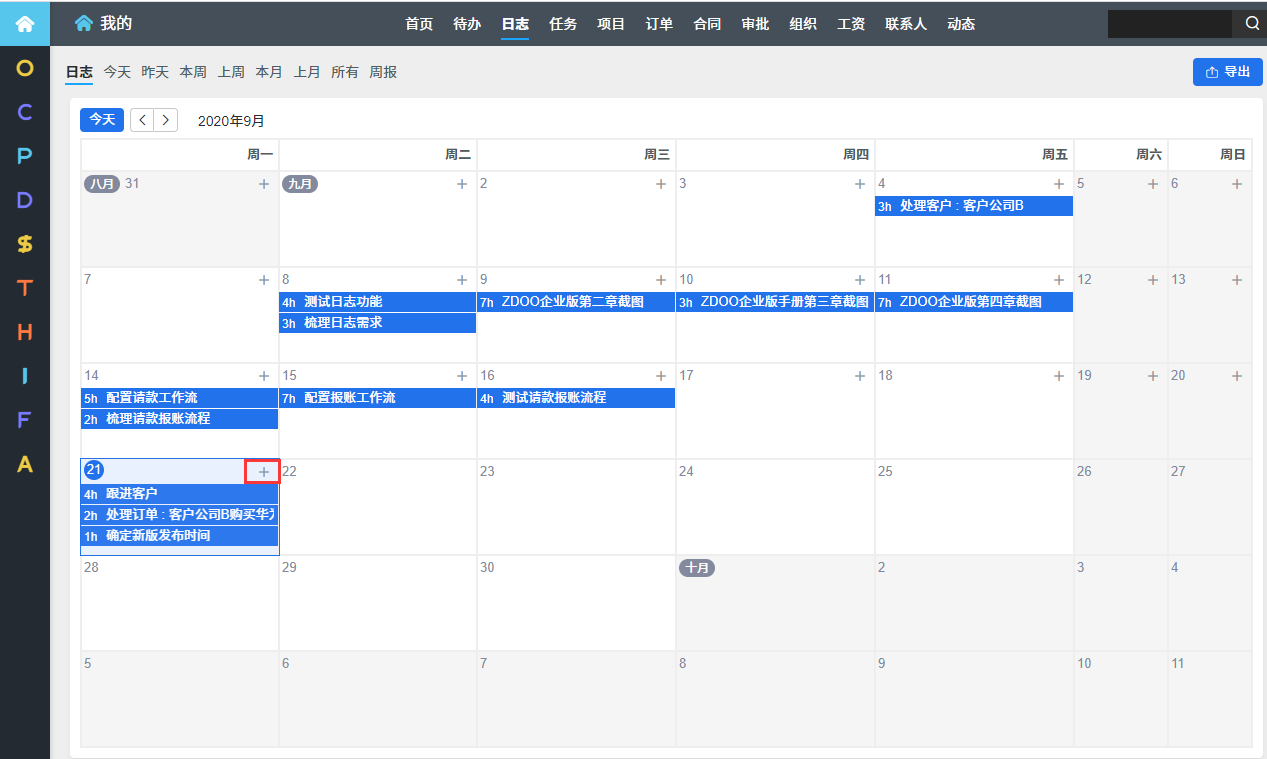 考虑到很多公司有对工作日志进行考核记录的需要,我们在ZDOO企业版本里面提供了工作日志管理的模块。