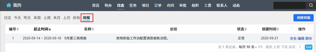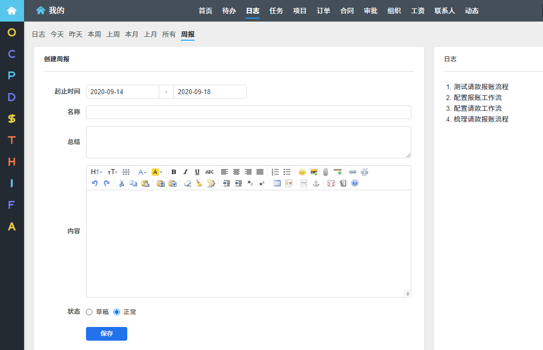 创建周报页面会在页面右侧显示起止时间内的日志列表,可以根据工作日志来写周报内容。