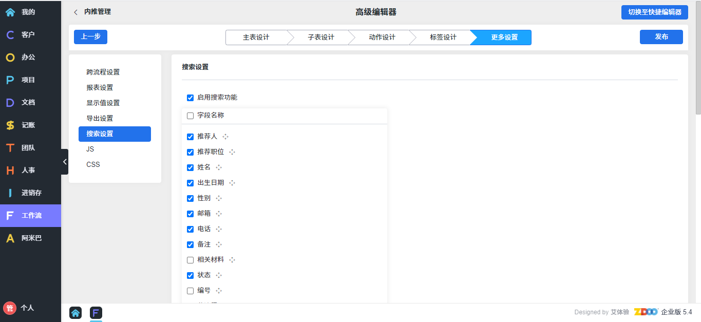 启用搜索功能,设置搜索字段;由于内推管理流程尚未搭建,所以暂时无法设置跨流程设置和显示值设置,暂且搁置。