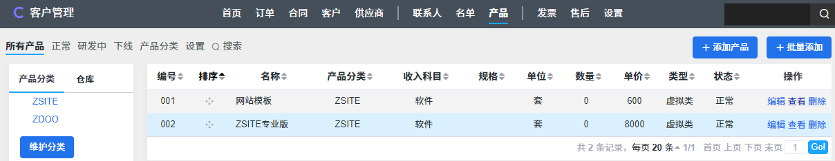 1. 登录ZDOO系统,进入crm模块的产品页面。