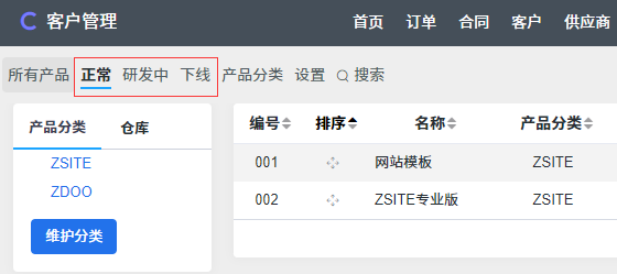 产品状态分为研发中,正常和下架。不再销售的产品可以设为下架,创建订单和合同时只能选择正常状态的产品。