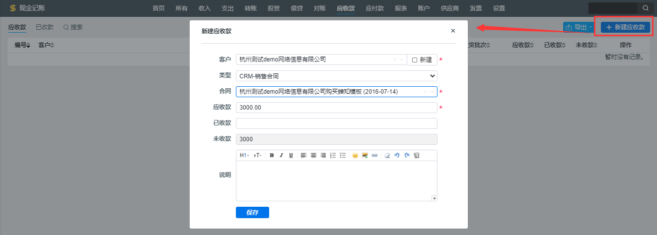 应收款可以进行收款操作,应付款可以进行付款操作。点击收款或者付款按钮可以生成一条收入或者支出记录。