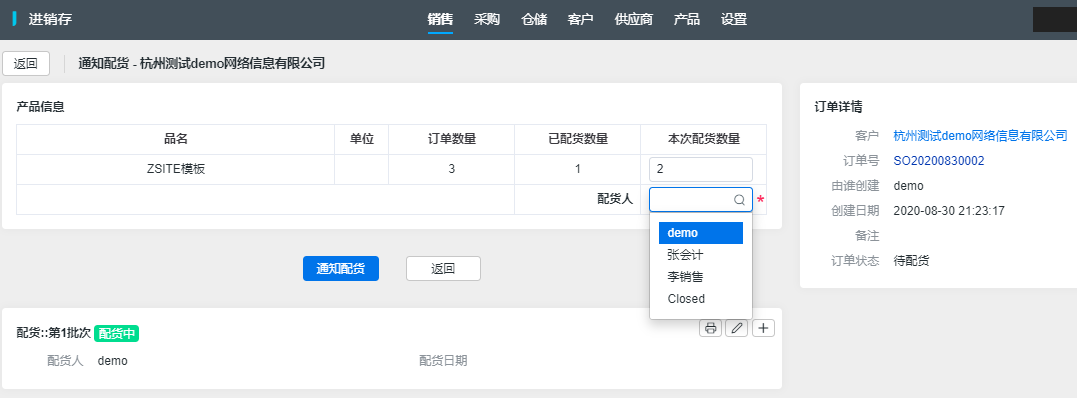 订单创建好之后,如果库存充足,可以点击“通知配货”按钮通知仓储人员进行配货。通知配货界面需要录入本次配货的产品数量和配货人。
