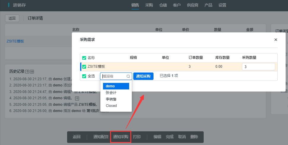 订单创建好之后,如果库存不足,可以点击“通知采购”按钮通知采购人员进行采购。通知采购界面需要选择待采购的商品,以及采购数量和采购人员。系统会自动根据订单数量和库存数量计算出一个参考值作为采购数量。