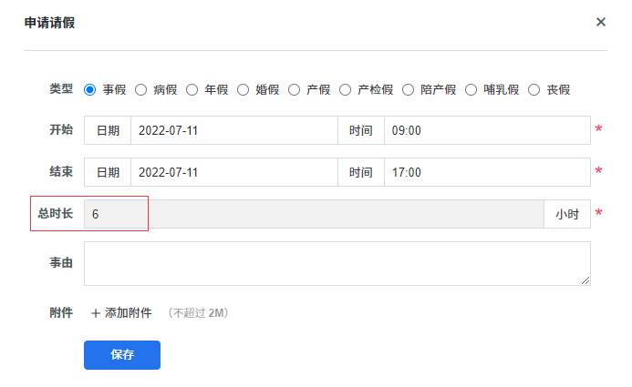 - 申请请假、补班、加班、调休时,自动根据工作日和上班时段计算本次申请时长。