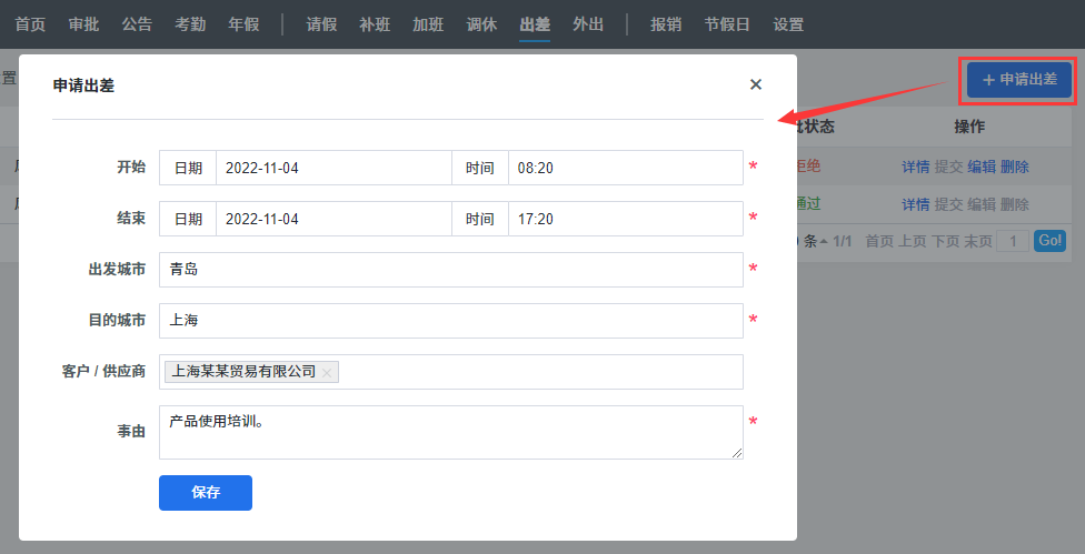 ▼ 审批模块增加出差和外出申请,增加查看详情的入口。