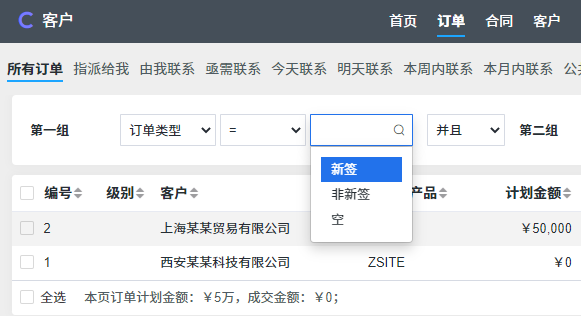 - 订单增加订单类型字段,可以选择新签或者非新签的订单,并支持搜索。