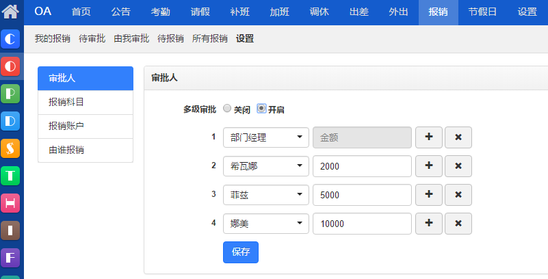 - 请假,调休,加班,补班,报销实现多级审批的功能