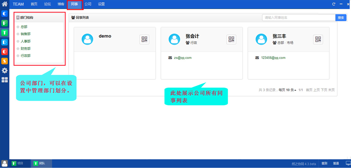 3.同事:可以查看公司当前的组织结构和联系方式。