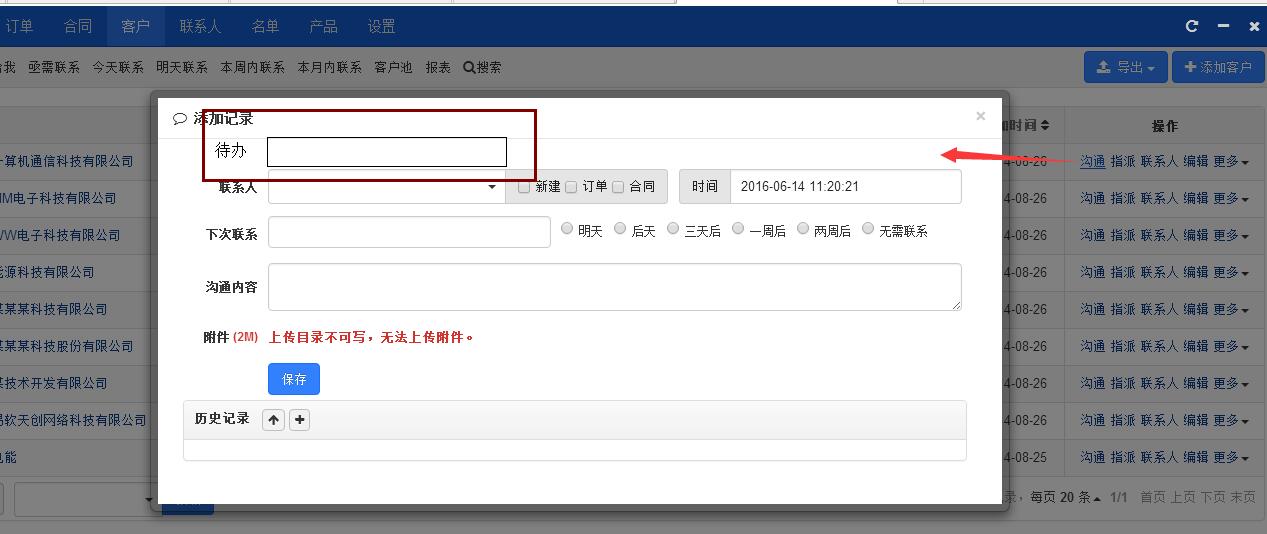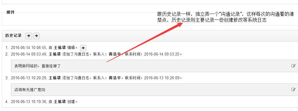 四、在客户具体页面里,和历史记录一样,单独弄一个“沟通记录”这样每次的沟通情况就一目了然了,不然的话,还得再历史记录里辨别一下,哪个是我自己添的沟通记录,哪些是系统记录的历史记录