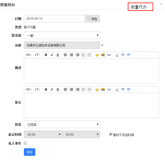 五、代办单页面,我们点击代办的日历,一下子就跳出来批量代办页面,这个有点不方便(特别是在描述里写具体代办的内容),我们往往是突然想起某个事需要某个人做一下。所以个人建议,想添加代办的时候,点击代办的日历,跳出来的是单个代办页面,跟跟新代办的页面差不多,但得有“指派给”某人的选择框,在右侧有“批量代办”的按钮,有一次性要新建多个代办的需求,就可以用批量代办。
