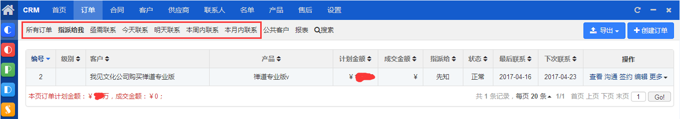 接下来,看我们的销售团队是如何用然之来管理和沟通客户的。 创建订单后,可以通过多个按钮,快速知晓哪些客户是急需联系,今天联系,明天联系,本周联系,本月联系的。 一目了然,分轻重缓急,让销售团队的成员能合理安排时间沟通客户。 不会一团糟,重复或忘记沟通哪一个客户。