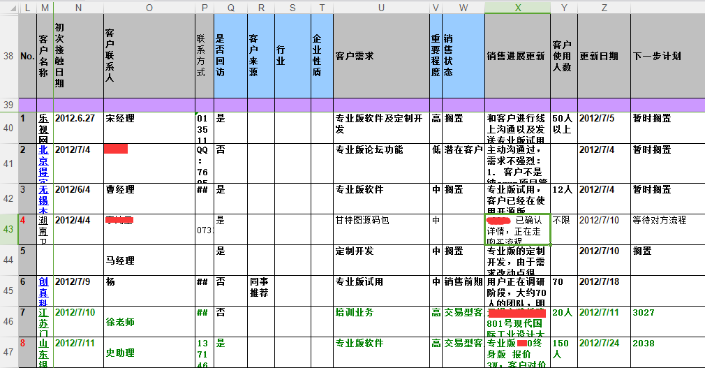 沟通是维系客户关系的重中之重。 把销售环节中最重要的客户沟通管理好,是非常有必要的。 刚开始,我们销售团队是用excel表格来统计和管理客户,刚开始客户量少时,还勉强应付得来。 客户量增加,尤其是销售人员增加后,就比较不好管理。 以下是我们销售人员使用excel表格管理客户的截图: